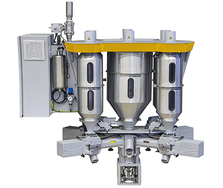 Fully modular construction allows up to 6 dosing units plus main material to be fitted to each extruder (including co-extruders). Precise dosing of costly additives and master batches takes place directly above the extruder throat.